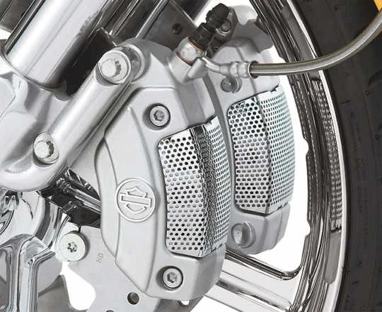 Verchromte Bremssatteleinsätze ersetzen die originalen seidenmatten Abdeckungen der Brembo Bremssättel.