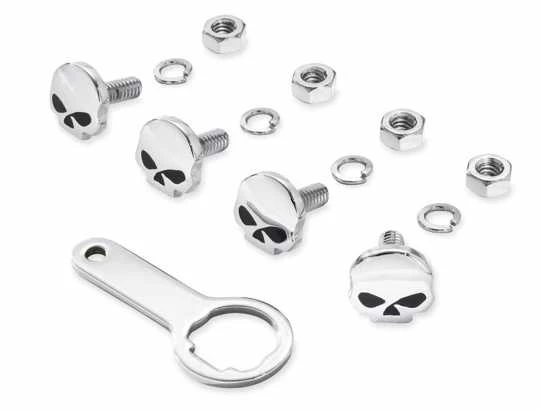 Zeigen Sie Ihr „wahres Gesicht“. Dieses komplette Nummernschild-Montagekit enthält verchromte Schrauben in Totenkopfform mit schwarzen Augenhöhlen.